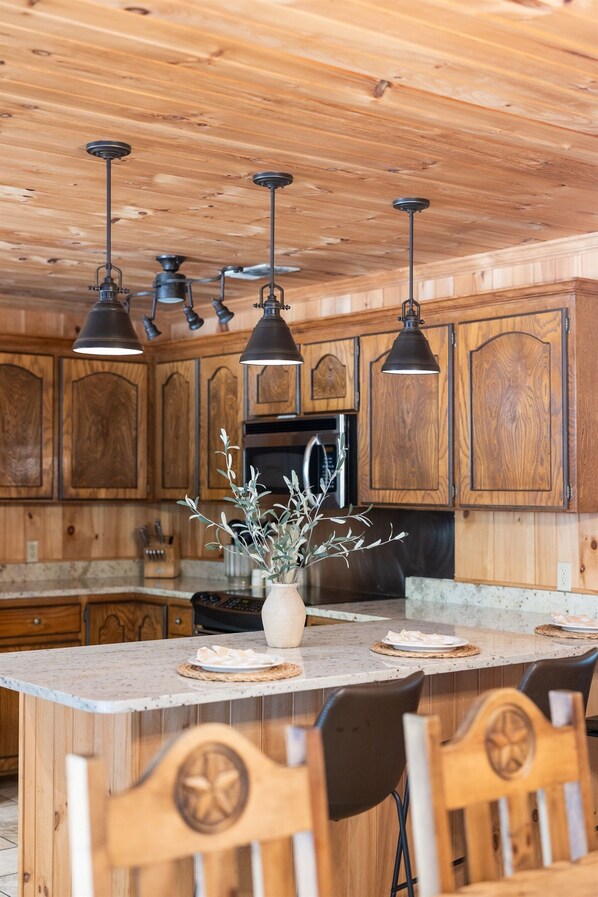 Rock Creek's large kitchen has plenty of seating for your hungry bunch and everything you need to enjoy family time while making a meal or playing table games! The kitchen is very well equipped and has large view windows, ensuring that you will never miss anything! You just may see some wildlife!