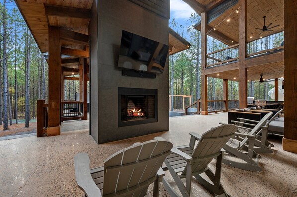 As you approach the grand front porch, complete with rockers to enjoy the view, you’ll step through the oversized front doors and your eyes will be immediately drawn to the 3,500 sq ft back patio with the first of two floor to ceiling fireplaces Stags Leap Lodge has to offer! With rocking chairs for 6 out back, a large sitting area with couches and ottomans, a pass thru bar area to the chef’s kitchen, outdoor dining area with grill, and not one but TWO of the biggest hot tubs you’ve ever seen, there’s a place for everyone!!