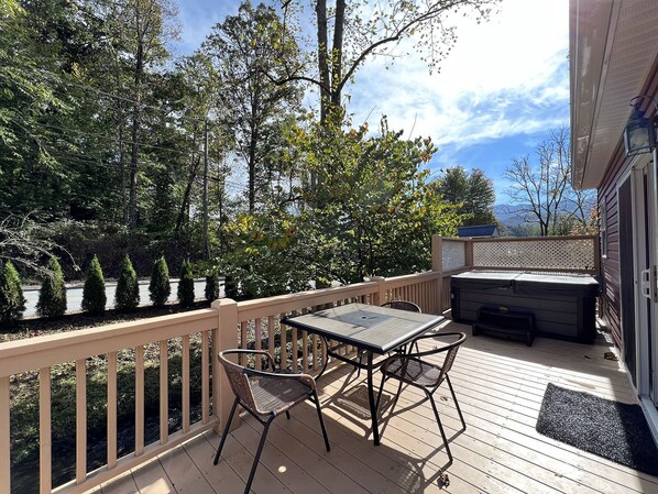 Snuggled Inn is a nice, modern one bedroom, one bath creekside cottage in the Bryson Village community.  This property has a nice deck, easy access, and hot tub.