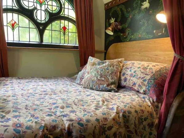 Once inside you’ll find a cosy double bed nestled beneath the beautiful stained glass window.