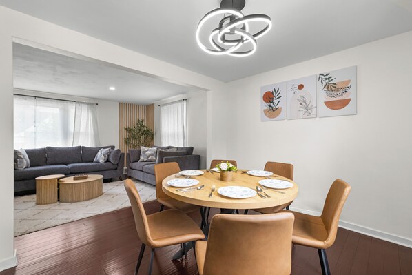 • Dining Room - Share meals and create memories in a stylish dining area featuring a table with comfortable seating for six. The space is enhanced by a simple accent wall and modern lighting that adds a warm, contemporary touch. Guests can enjoy meals on quality Corelle plates, adding elegance to your dining experience.