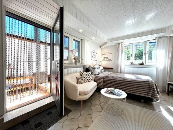 L'appartamento dispone di un letto largo 140 cm, ideale per un accogliente pernottamento per due persone. L'ingresso indipendente e il parcheggio per un'auto vi offrono il massimo comfort. L'area salotto all'aperto offre la possibilità di fare colazione all'aperto o di bere un drink la sera.