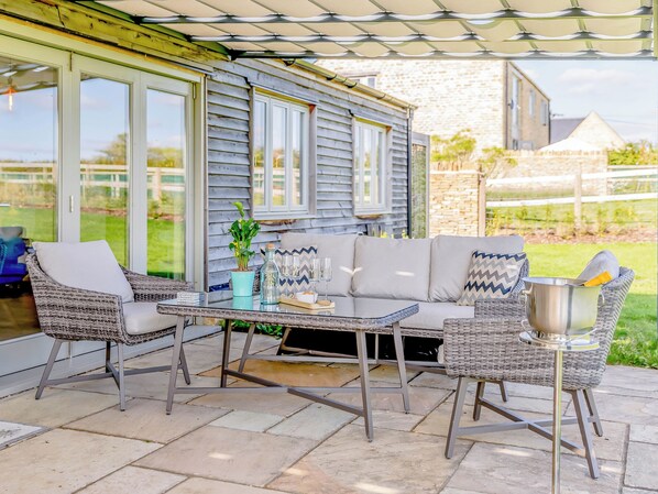 Bathroom: Bath With Shower Over, Heated Towel Rail, Toilet. Air source underfloor central heating, electricity, bed linen, towels and Wi-Fi included. Logs for wood burner and pizza oven included. Charcoal for BBQ included. Welcome pack and welcome basket on arrival. Enclosed lawned garden with patio, garden furniture, pizza oven and charcoal BBQ. Private parking for up to 4 cars. No smoking and no pets.. Located in picturesque Cotswold countryside is this stunning holiday home, part of a small group of converted barns surrounded by farm and woodland on the outskirts of Burford. This large house with exceptional interior design and layout is spread over two floors with bedrooms both on the ground floor and first floor, perfectly separated for two families. Guests will enjoy the comfort of having three bedrooms boasting their own en-suite and the remaining two bedrooms share a family bathroom. A large living room with wood burner is a great place to unwind after a day out in the beautiful countryside or spend time in the spacious kitchen/diner/family room which opens up with doors to the patio and garden, making it perfect for entertaining. Here you can cook outside on the large pizza oven or barbeque and enjoy some shade under the canopy or play garden games on the large lawn area.