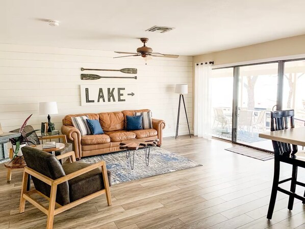 Un'ampia zona giorno a concetto aperto vi accoglie con nuovi arredi, nuove decorazioni, un accogliente caminetto, una nuova Smart TV a schermo piatto da 65 "con Netflix e YouTube TV e un tavolo da pranzo formale - perfetto per il vostro lago ritiro.