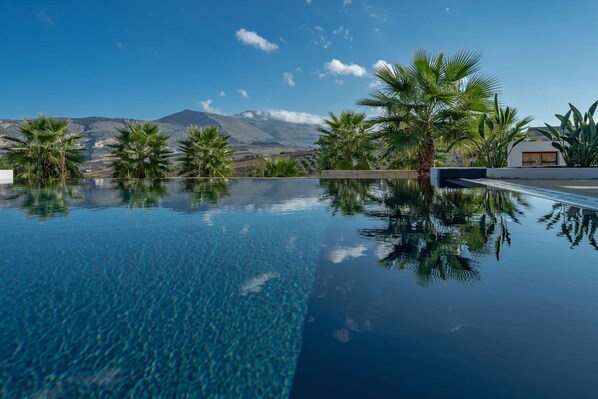 A grey salt filtered infinity pool- length 11m x 7m wide, 1.40m deep with views of the countryside, 300sqm of tiled area surrounds it.