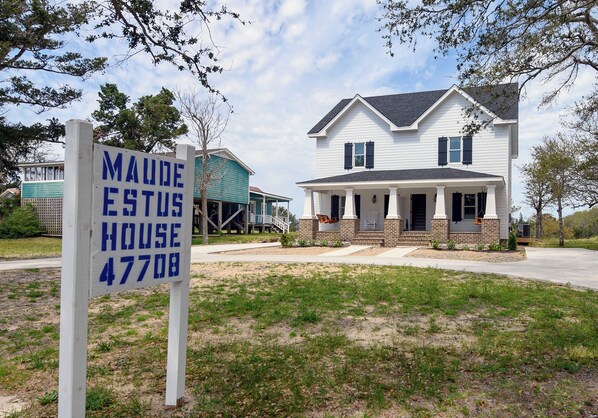 This duplex known as the Maude-Estes House was recently rebuilt to be a better version of the historic house that stood in this footprint for nearly a century. Each half is a mirror floorplan of each other. Access the front entrance by climbing a few custom brick and stone steps between the rose bushes to the front porch, which boasts a rocking chair and a porch swing. Upon entering, off to the side, there's the living room with comfortable seating and a Smart T.V. Beyond the living room, enter the full kitchen through the custom arched hallway. Full stainless steel kitchen appliances with all the pots, pans, dishes and silverware provided. Off the kitchen is a half-bath with a full-sized coin-operated washer and dryer for your convenience. Access to the back patio is off the kitchen, as well. Back to the front entrance, straight ahead through the door is the full staircase to the second floor. Second floor has a master suite with a full bathtub and shower with a Smart T.V., a second bedroom and another full bathroom, The third-floor staircase accesses the private loft bedroom with views of the Pamlico Sound through the windows. There's ample parking on the property. Pets are not permitted in the duplex.