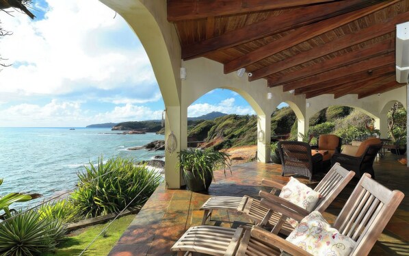 Across the courtyard from the Villa, the fully air conditioned Cottage features a comfortable bedroom, a sizable bathroom with tankless hot water, and a spacious lounge area and dining nook. Prepare your meals in the well-equipped kitchen or sip coffee on the covered balcony while taking in dramatic views of the ocean just a stone’s throw away.
