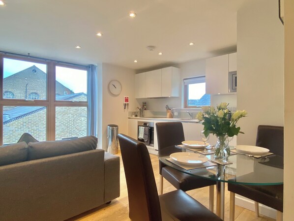 We had a one-bedroom flat on the 2nd floor. Steep staircase, no lift. The area is quiet; Tescos and the Co-op are at the end of the road. The flat is well supplied with utensils, etc for cooking. Operating the TV is easy, although I don't think the property has a TV licence.