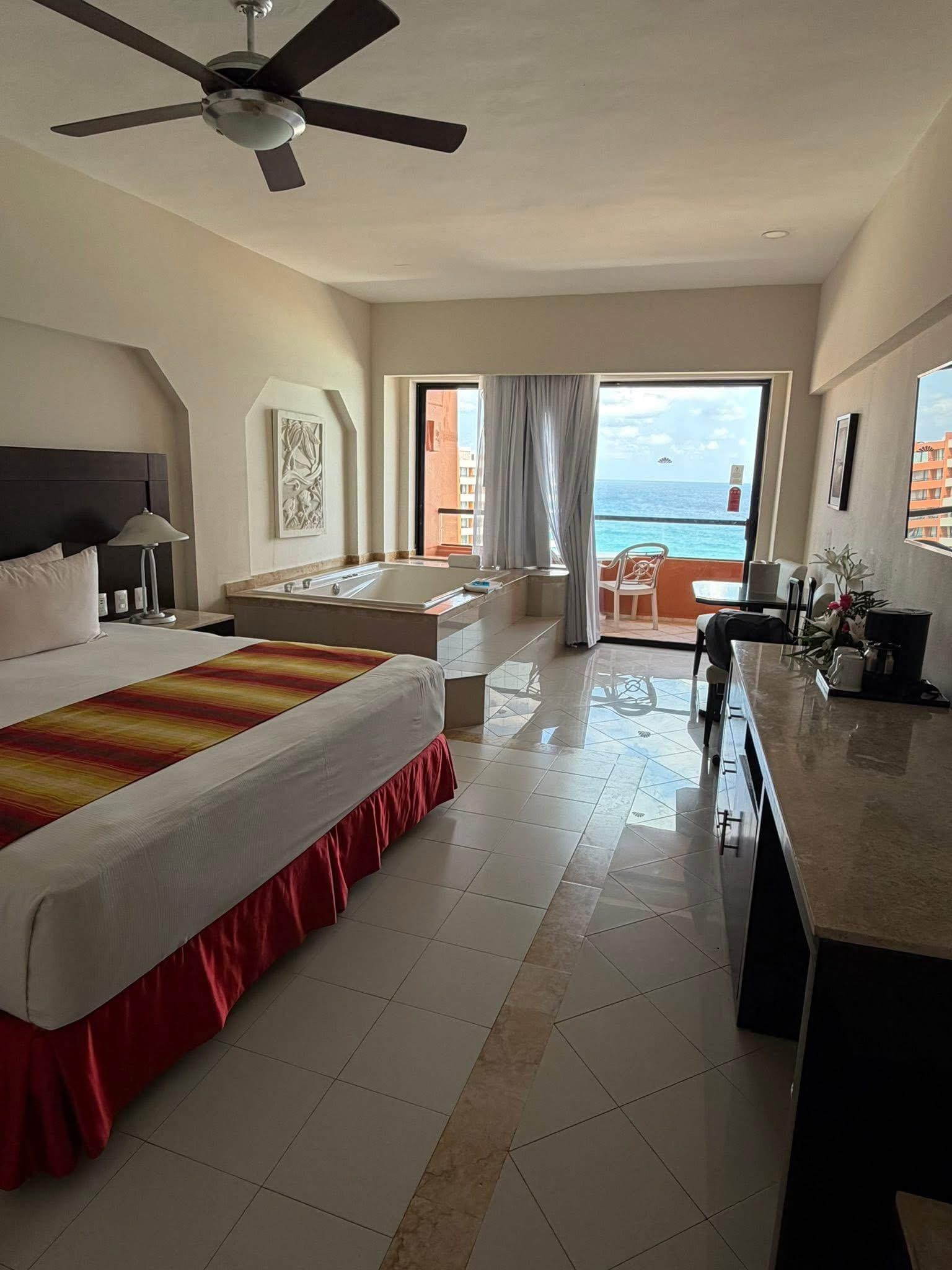 Pretty room, but could use a better cleaning vs high level surface cleaning. Resort beautiful, views spectacular. Buffet was best option. Most staff were attentive, polite, and seem to enjoy their job. Had one really bad incident with reception employee and two managers got involved. They were professional and listened great! Not sure I’d go back to all inclusive but if you like that type of environment it’s a great place and nicely located.