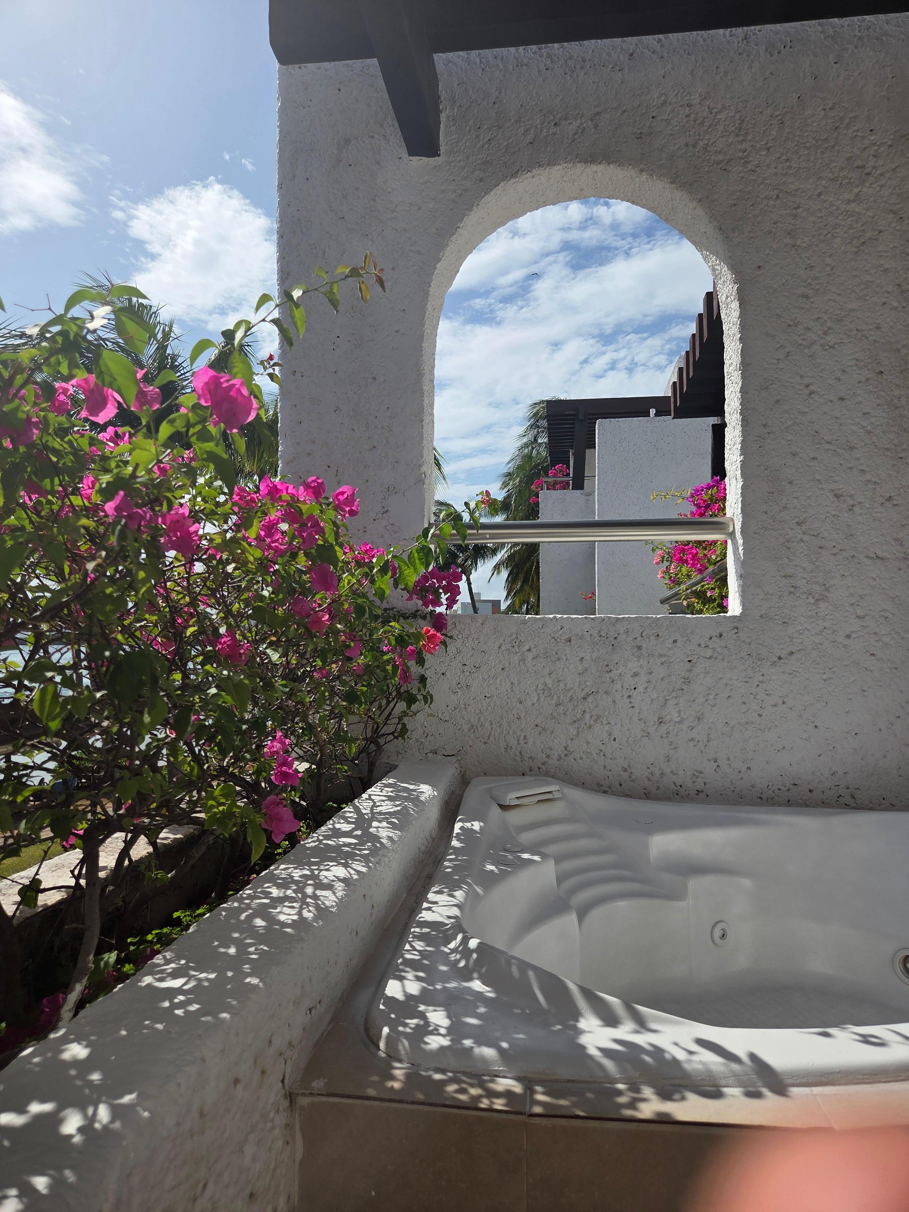 very large and clean room with a hot tub on the balcony, beautiful resort, pool bar, family friendly, the food was okay, and hot tub was available