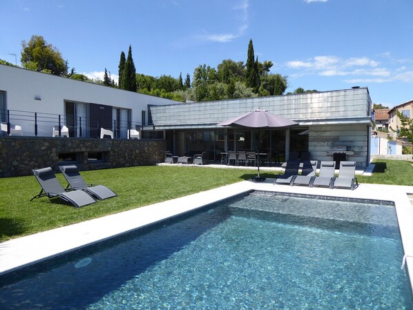 Godetevi la piscina e la terrazza con lettini, salone all'aperto, tavolo da pranzo all'aperto, barbecue.