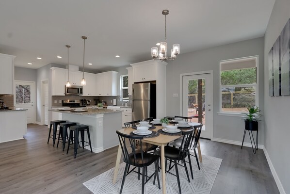 The kitchen comes fully equipped for whipping up some dinner, followed by a smores over the firepit. Grab your favorite drink and lounge out on the patio soaking in the hill country night stars!