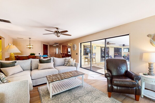 Inside, you'll find a bright and open space with two living areas, one with a workspace, and two smart TVs. A formal living area offers comfortable seating and a chaise lounge. A desk with a computer monitor is ideal for guests working remotely. The second living area is furnished with a sectional, chair, recliner for the group, and a 70-inch TV. The well-equipped, full kitchen is appointed with a suite of stainless-steel appliances as well as ample cookware and helpful gadgets. A convenient service window opens to a bar on the lanai. Keep the chef company at the kitchen bar, and when it’s time to dine, gather at one of two tables.