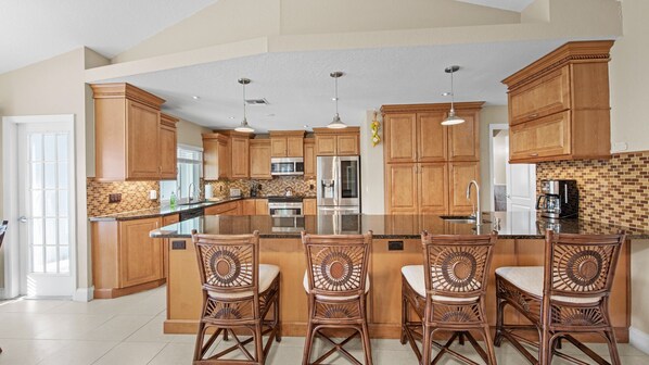 Welcome to Cape Coral Reef, a rare and beautifully designed courtyard-style home offering comfort, privacy, and space for large families or groups. This expansive 5-bedroom, 3-bathroom property features a main home and two private guest suites—ideal for multigenerational vacations or guests seeking added seclusion.