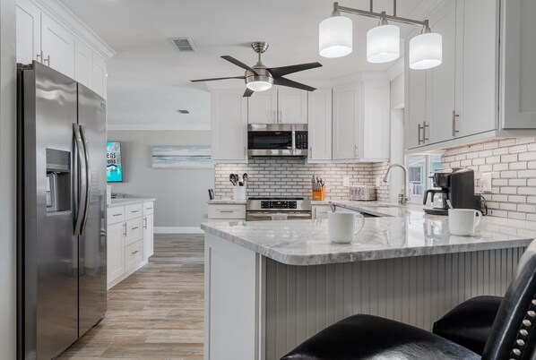 Cook up your favorites in the well-appointed kitchen, complete with stainless steel appliances, granite countertops, and plenty of prep space. Whether you're whipping up breakfast or mixing poolside cocktails, you'll find everything you need right here.