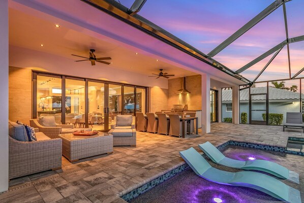 Outdoor Kitchen & Lounge: Enjoy outdoor living at its finest with a fully equipped kitchen and BBQ grill under the covered lanai. Whether you're grilling up a delicious meal or dining al fresco with loved ones, this inviting space is perfect for entertaining and making lasting memories.