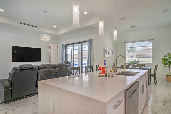 Kick back and relax when you book this Cape Coral vacation rental! With 4 bedrooms and 2.5 bathrooms, this stylish home offers plenty of space for everyone in your crew. Make a splash in the heated pool, fire up the gas grill for a cookout on the screened-in lanai, or enjoy a movie on any of the 4 Smart TVs. When you’re not busy luxuriating by the poolside, take the kids to visit Sun Splash Family Waterpark, or head to Yacht Club Public Beach for a day filled with surf and sand.
