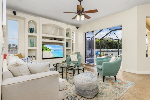 A private tropical paradise awaits at this lavish 3 bedroom/2 bathroom getaway, boasting a screened lanai with a heated pool. Whip up delicious meals in the pristine kitchen, or keep things simple and take advantage of the gas grill outside. Unwind on chic furniture in the outdoor lounge.