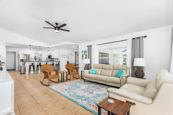 Paradise Cove is a spacious home with two living areas, a dining room and eat in kitchen, 4 bedrooms and 2.5 baths. It comfortably sleeps 12.