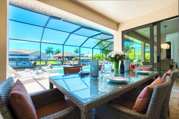 From the elegant, light-flooded living room (with 60'LCD + DVD player) you can enjoy the view of the large pool, the wide canal and the tropical garden. The sliding glass doors can be opened completely, so that there is a great inside-outside feeling.