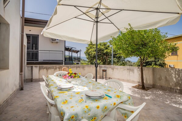 Questa casa vacanze vanta un'area esterna privata con una terrazza aperta, un balcone e un barbecue.