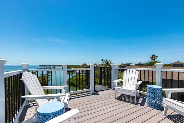 -Bedroom 1 – Primary Suite (Top Floor): Luxurious king bed, en-suite bathroom, and a private bayfront terrace with screened and open-air seating — ideal for sunrises and stargazing