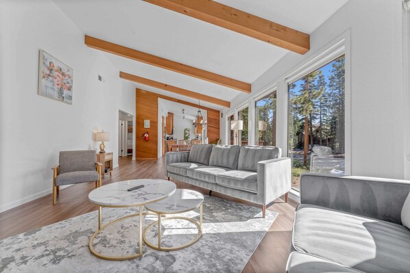 If relaxation in the great outdoors is what you are looking for, this North Lake Tahoe gem has everything you need for an amazing Lake Tahoe vacation. The home is situated on a quiet street, backing onto Tahoe National Forest, where you will find an endless network of trails. During the winter months, you can hit the trails and enjoy cross-country skiing and snowmobiling, while in the summer these same trails turn into perfect areas for hiking, mountain biking, or dirt biking. For those coming for a winter getaway, this home puts you near some of the best skiing in the area! The Tahoe Nordic Cross Country Center is just a 7-minute drive away, and both Palisades Tahoe and Northstar Ski Resort can be reached within 25 minutes. In the summer months, take on the Tahoe Rim Trail, or, enjoy a beach day at Carnelian West Beach, just 10 minutes away. For those in your group looking for a little less outdoor time, Tahoe City is less than a 10-minute drive away, where you will find many cute boutique shops, a wide variety of bars and restaurants, farmers markets, and live music.