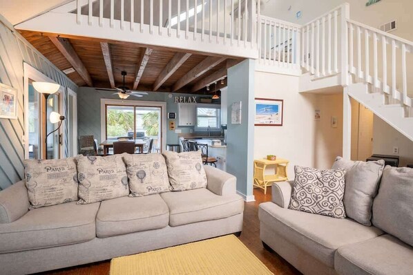 Living Room: Sofa/loveseat, wicker occasional tables, decorative fireplace, cathedral ceiling with ceiling fan, wall-mounted TV, Wifi.