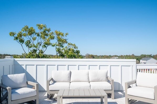 The best place in Carolina Beach to watch the summer weekly fireworks is up on your very own spacious roof top deck!  With panoramic views of the ocean, harbor and boardwalk, you will want to be up there to experience the entire day from sunrise to sunset. Designed for entertaining, your rooftop deck has a built in grill, wine chiller and plenty of space for sunbathing, stargazing or just sipping coffee or cocktails with your family. King Beds and Samsung TVs in every couple’s bedroom, plus a family suite for the kids, make this the perfect beach house to spread out while still having privacy. An open floor plan with comfy living room and a top-of-the line kitchen complete with Bosch kitchen appliances is fully equipped for meals at home. A fully fenced, landscaped back yard and outdoor shower make it easy to bring the family dog, and come and go from the beach only a two block walk away. The easy stroll to the beach, boardwalk, dining, shopping and nightlife will make this your perfect beach vacation in the heart of the Carolina Beach Boardwalk.