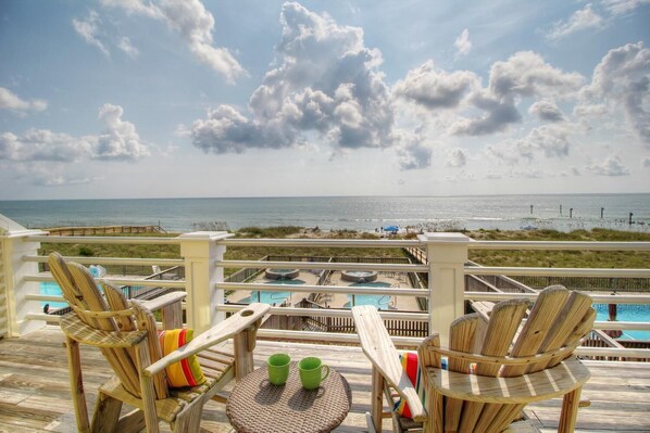 Bello, duplex di fronte all'oceano situato a Kure Beach, Carolina del Nord. La casa è dotata di una piscina privata con vista sull'oceano e vasca idromassaggio. Ha cinque camere da letto e quattro bagni.