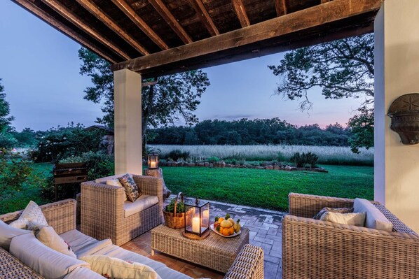 La Villa è stata realizzata e restaurata con cura e un tempo utilizzata come casa di famiglia all'interno della tenuta. Ora è dotato di piscina privata e giardino con vista sui boschi immacolati tutt'intorno. La villa dispone di ampi spazi esterni, perfetti per rilassarsi dopo una lunga giornata di visite turistiche. Un ampio portico/veranda con zona pranzo ha una vista dominante sul paesaggio, così come la piscina. Attrezzature per bambini come culla e seggiolone accolgono anche i visitatori più piccoli.