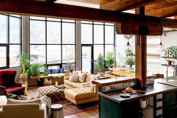 Immergetevi nella vista montagna / lago, finestre dal pavimento al soffitto, soffitti ariosi da 20 ', cucina di lusso con isola, accogliente caminetto a gas e altro ancora ..