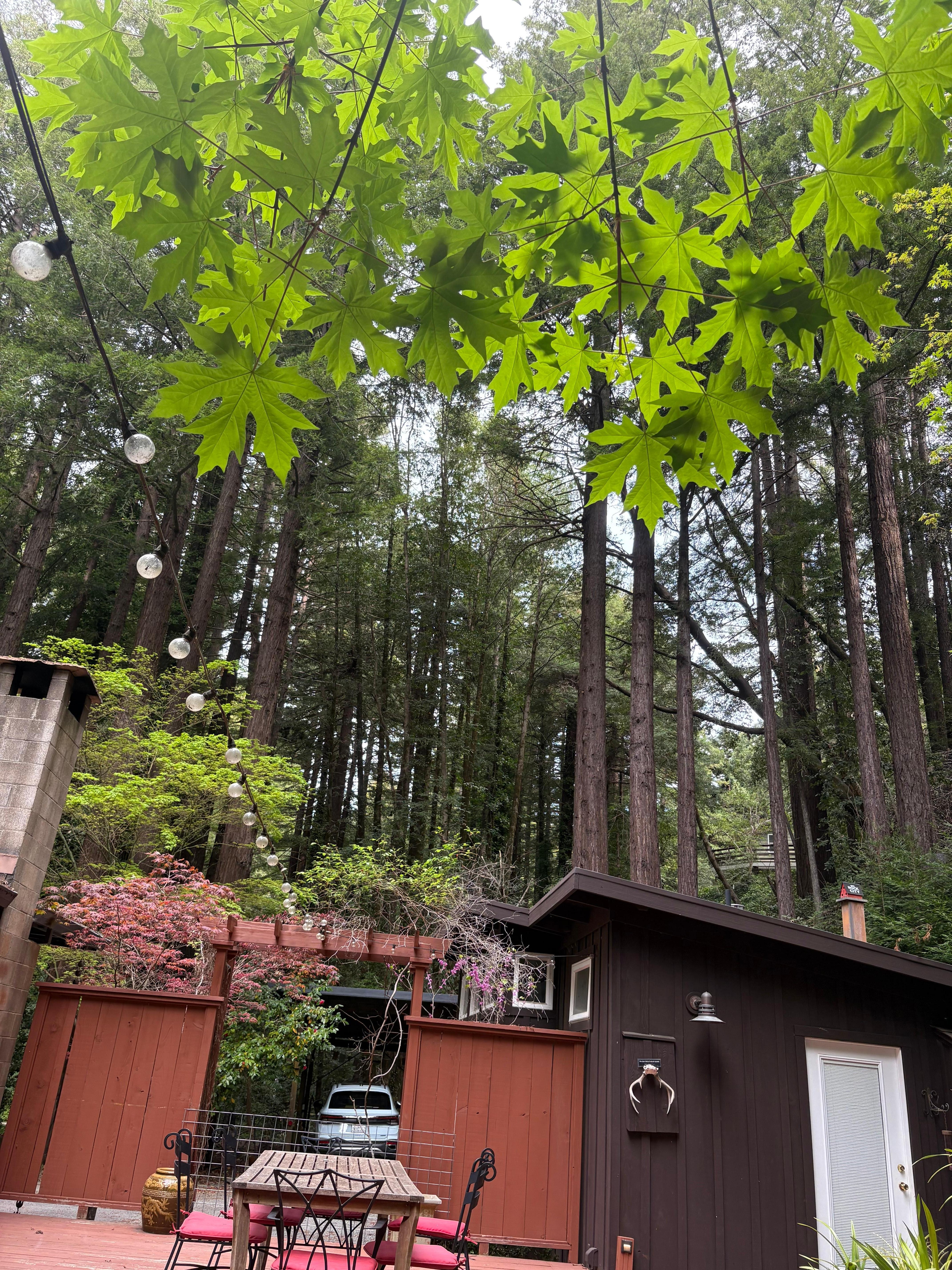 Felci autoctone, rododendri e mirtilli prosperano sotto gli alberi di sequoia con aceri giapponesi, rose rampicanti e camelie. Le famiglie, gli amici, i proprietari di cani e tutti gli altri adoreranno soggiornare in questo tranquillo rifugio nel bosco, a breve distanza in auto da ristoranti e cantine di livello mondiale. L'escursionismo nel Armstrong Redwoods State Park o lungo la costa di Sonoma è a pochi minuti.