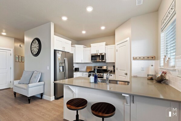 Well appointed townhouse with ample room for the 4 of us. Cooking many meals in after long days hiking was a pleasure in this well appointed kitchen. Only down side was limited outdoor space and view to relax after strenuous hikes. Proximity to towns and national parks was a plus. Would stay again. Hosts very responsive to questions and information