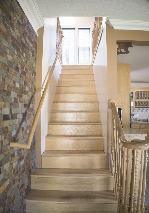 Upstairs features cathedral ceilings, large south facing windows, well-lit dedicated office space, and family room with a small couch large enough to sleep on if you are not too tall, as well as a closet for your use. There are some books, games, puzzles and toys available as well.