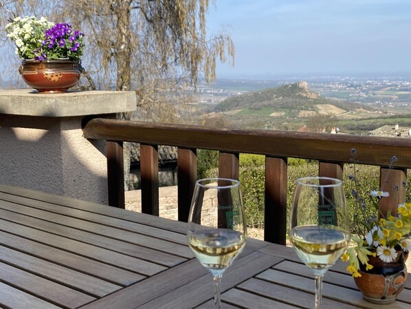 This character gîte is located in a detached house in the heart of a hamlet facing the Roche de Solutré, between northern Beaujolais and Saône et Loire. It has an enclosed courtyard at the front and a large terrace with uninterrupted views, and a shady garden with trees and a terrace at the back. Ideal for a relaxing stay in the countryside, this accommodation can sleep up to 6 people in 3 bedrooms (2 of which are located outside the dwelling, on the garden level). First floor: large living room opening onto a terrace and the garden to the rear. Dining area, open-plan kitchen and sunken sitting room with fireplace. 1 bedroom (1 double bed), shower room and separate wc. Non-adjoining ground floor: 2 interconnecting bedrooms: 1 bedroom with pull-out bed (2 single beds or 1 double bed), 1 bedroom with 2 single beds. Shower room and separate wc (access via the second bedroom). Terrace with garden furniture, lounge, plancha, swing. Enclosed herb garden. Enclosed courtyard, garage with washing machine (car parking possible).