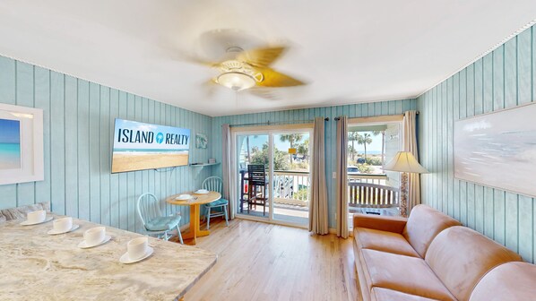 Well decorated and appointed condo. Quiet with a view and close to restaurants (parked the car and didn't move it until we left). Loved the private pier and beach access. It was just right for a girls weekend get-away!
