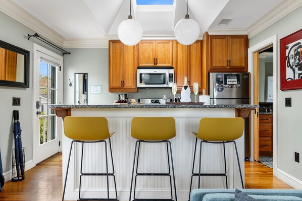 Inside, the open-concept living space is bright and inviting, with skylights that fill the home with natural light. The comfortable seating area and large Smart TV make it easy to unwind, while the newly renovated, fully equipped kitchen includes counter seating for three, perfect for morning coffee or a casual meal.