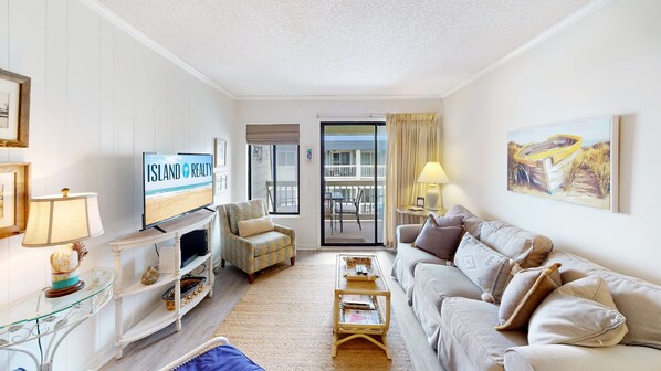 Bed #3: The living room includes a sleeper-sofa, and flat-screen TV.