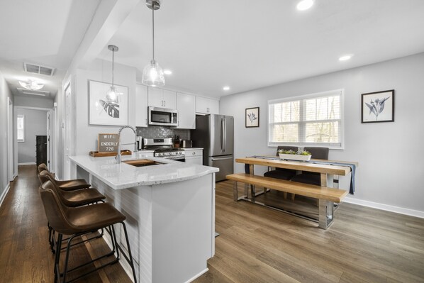 This three bedroom, one bathroom home just underwent a full renovation both inside and out. Whether traveling for business or pleasure, you'll have everything you need with Spectrum high speed internet/WiFi, a fully equipped kitchen, Keurig coffee machine along with a washer & dryer. The open living room is filled with ample seating along with a brand new 55" smart TV with Spectrum cable. The sofa also pulls out into a full size memory foam mattress. The kitchen is stocked with brand new stainless steel appliances, air fryer, and a large dinning table for gathering around.