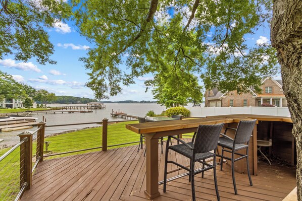 Ottima posizione su Lake Norman! Due bacini - uno per una barca e una per godersi un picnic con un bicchiere di vino e stuzzichini! ponte portico anteriore ha grill a gas - proprio fuori dalla porta della cucina. Incredibile ponte intrattenimento cortile (oltre 1200 sq ft) con sedie a dondolo, costruito nel bar, e un sacco di spazio per rilassarsi mattina, mezzogiorno e sera! Free WiFi e TV via cavo con canali premium.