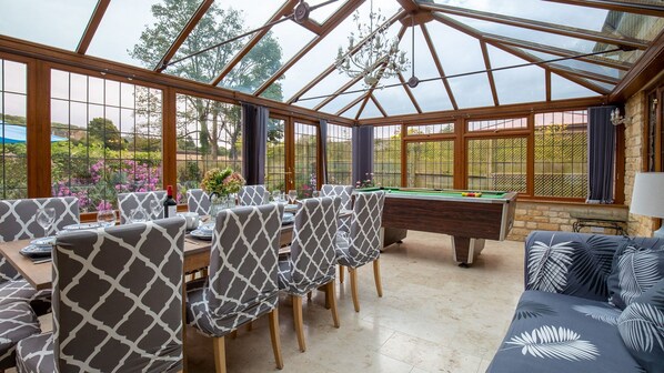 Leading through from the living room on one side and the breakfast room to the other side is the conservatory, with its arching glass roof and fantastic countryside views. This fabulous room, with its 10-seater dining table, provides a wonderful dining space that's airy and bright in the summer and cosy in the winter - thanks to the underfloor heating. Beside the dining table is a long sofa and table with a sound bar and a full-size pool table. French doors lead directly from the conservatory into the garden, blending indoor-outdoor living perfectly when the weather allows.