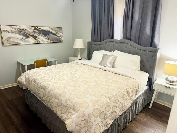 Welcome to Kam Suites, your ideal retreat in Chicago! This spacious apartment comfortably sleeps five guests, featuring two bedrooms with all queen-size beds, one king-size bed, and one twin bed. There are two couches and a foldaway cot available upon request for extra sleeping options. Located just minutes from Lake Michigan and downtown Chicago, it offers easy access to top attractions, making it perfect for exploring the city.