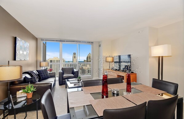 Step into your private 52nd-floor retreat and be greeted by floor-to-ceiling windows that frame breathtaking views of Lake Michigan. The open-concept living space is designed for both relaxation and entertainment, featuring a large living room and a formal dining area. The fully equipped kitchen boasts modern stainless steel appliances, ready for you to prepare a gourmet meal or a quick snack. From the plush seating area to the dedicated workspace, every detail is curated for your comfort and convenience.