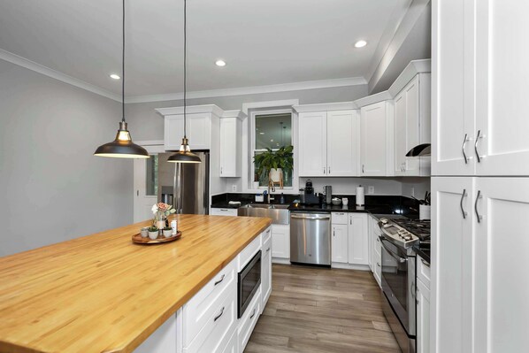 Back at the home, you’ll find updated spaces with enough room for the whole group to spread out and find their own private sanctuary. Step through the front door into the open living room where a comfortable sofa and armchair await, along with a large, mounted smart TV serving up all your favorite show and movies. Continue on into the dining room where you’ll find a stylish table and chair set for 6, illuminated by a modern light fixture. From there, you’ll discover the chic kitchen with stainless steel appliances and glossy countertops, a large island offering an additional 5 high-top barstool seats perfect for casual bites or enjoying a spread of afternoon hors d’oeuvres. You’ll find everything you need here to whip up delicious homecooked meals whenever the mood strikes.
