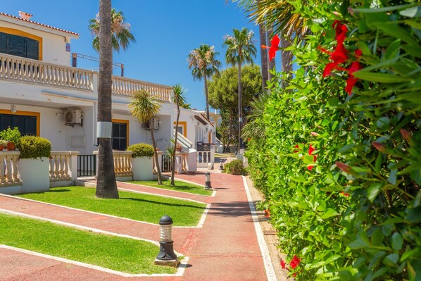 Nel sud-ovest dell'isola balearica di Minorca, a Cala en Bosc, l'appartamento vacanze A4 di 50 m² si distingue per la sua posizione ideale. Fa parte di un piccolo complesso residenziale e condivide una zona esterna con altri appartamenti. L'appartamento si trova al piano terra e dispone di un moderno soggiorno-pranzo, una cucina americana ben attrezzata, due camere da letto (una con due letti singoli) e un bagno, con una capacità per 4 persone. È dotato anche di aria condizionata e televisione. Davanti all'abitazione troverete un piccolo portico privato con comodi mobili da esterno e un arredamento contemporaneo, perfetto per godersi le calde serate estive. Il giardino condiviso, arredato e circondato da alti pini, invita a trascorrere vacanze rilassanti in famiglia. L'area piscina offre una piscina comune, una piscina per bambini e docce esterne per rinfrescarsi. Negozi, ristoranti, bar e caffetterie si trovano a 300 metri, mentre la spiaggia più vicina, Cala en Bosc, dista 700 metri o 9 minuti a piedi dall'alloggio. Godetevi la spiaggia di sabbia bianca e una vacanza indimenticabile in un ambiente mediterraneo.