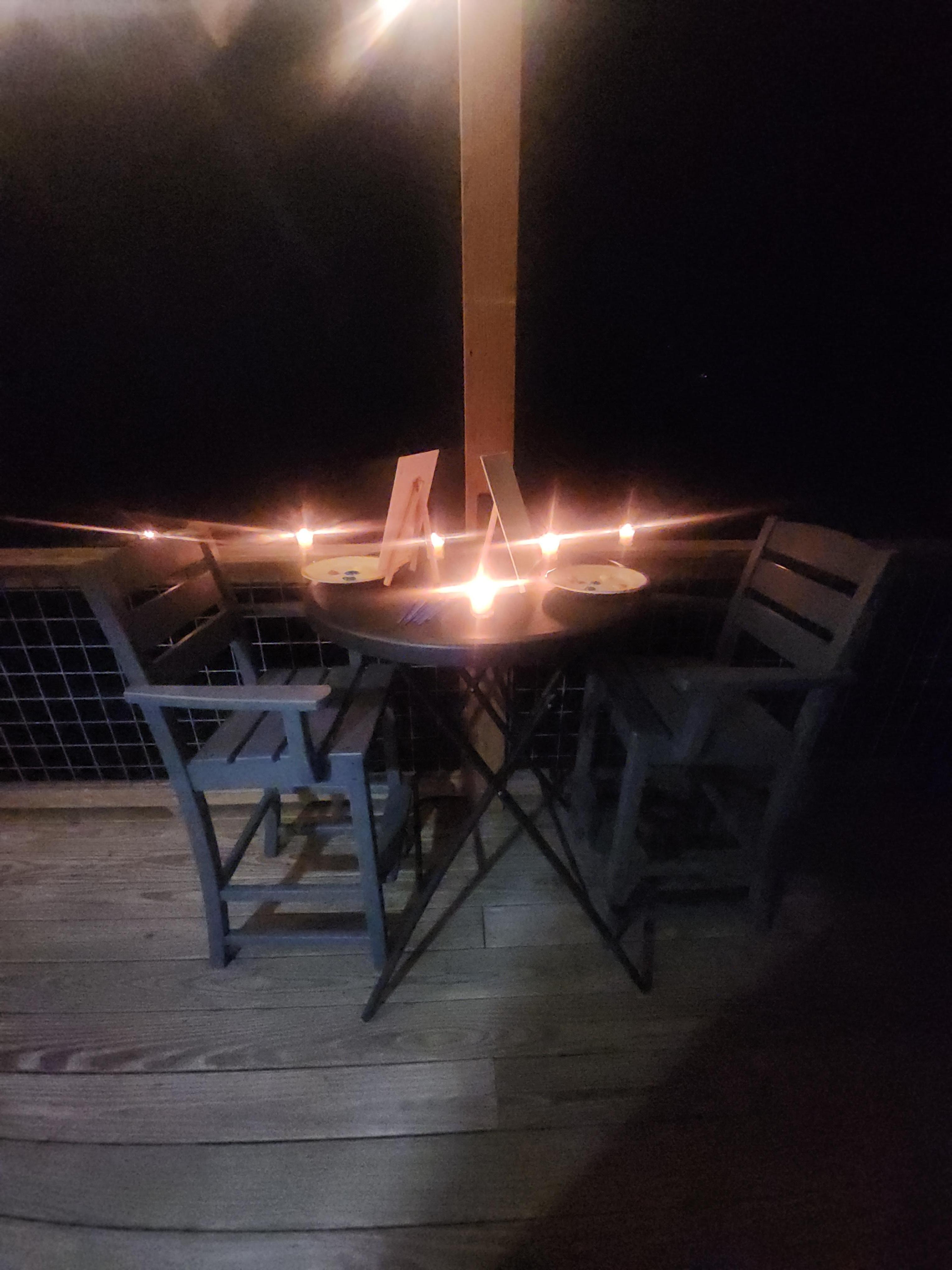 The deck is partially covered and includes a gas fire table, creating a cozy spot for both sunny afternoons and crisp fall evenings. Guests are welcome to enjoy the outdoor seating and the natural beauty of the surrounding 8 acres.