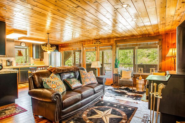 Inside, you’ll find all the comforts of home. Hardwood floors, pine-paneled walls, and a cozy woodstove enhance the cabin vibes, and the open layout makes gathering together easy. The chef will love the full, well-equipped kitchen, which features stainless steel appliances and plenty of prep space, and the gang can eat together at the large dining table. Spend the day exploring and then relax together in the living room in front of the woodstove, or head upstairs to the second living space.