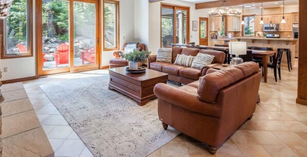Relax and gather with the modern comforts of this mountain retreat including a spacious covered and heated outdoor dining and BBQ patio, outdoor fire pit, and new private hot tub. Inside, enjoy abundant entertainment options including free high-speed internet, three flat-screen Smart-enabled TVs, and Blu-Ray movie library in addition to Air Conditioning throughout the entire house.