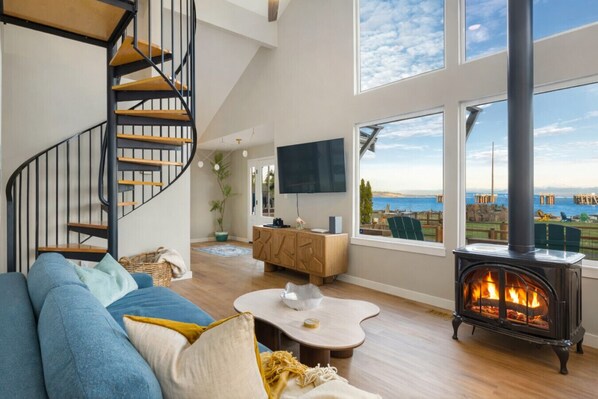 This bright, open-plan home is designed to maximize the stunning waterfront setting. Large windows fill the living area with natural light, while the cozy fireplace and striking spiral staircase add warmth and architectural charm.